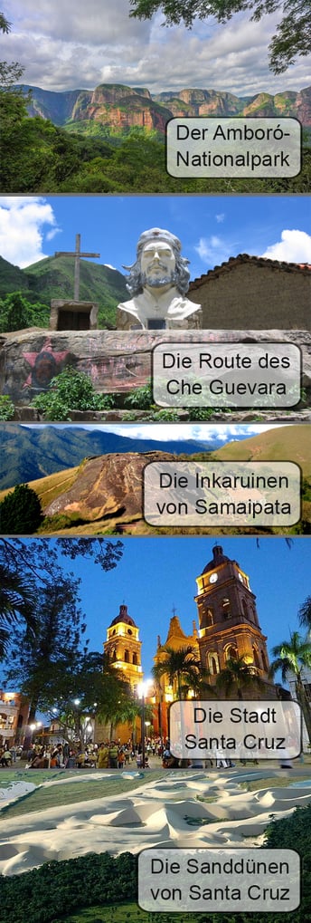 Zum anderen kann man die "Ruta del Che" nehmen, also den Reiseweg des legendären kubanischen Guerillaführers Che Guevara während seiner letzten beiden Jahre 1966 und 1967 in Bolivien. Heute ist die Route